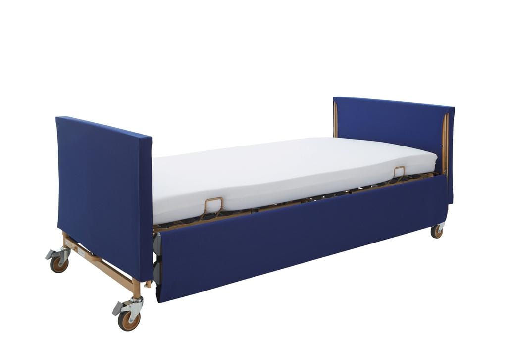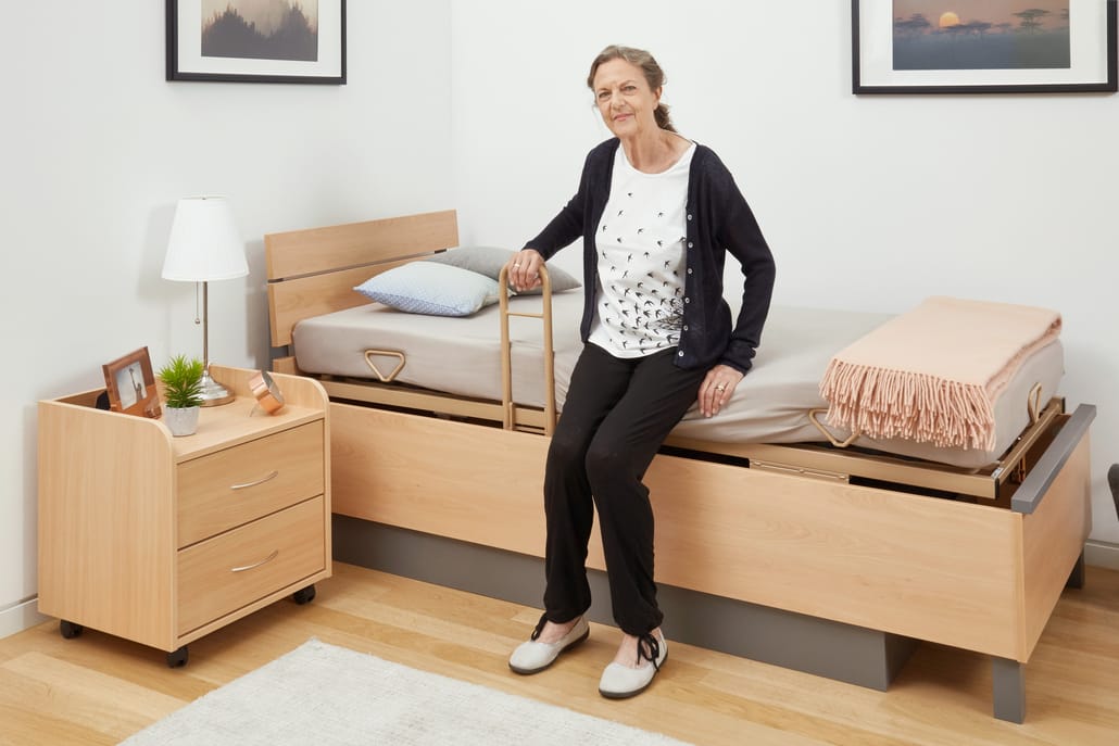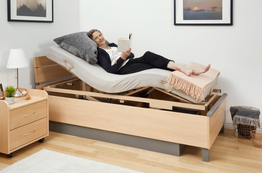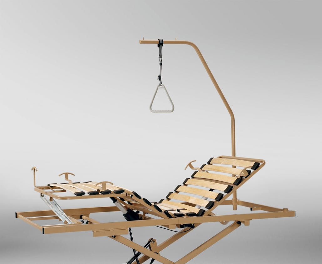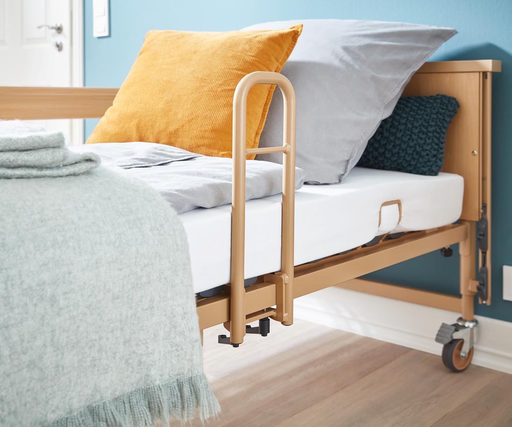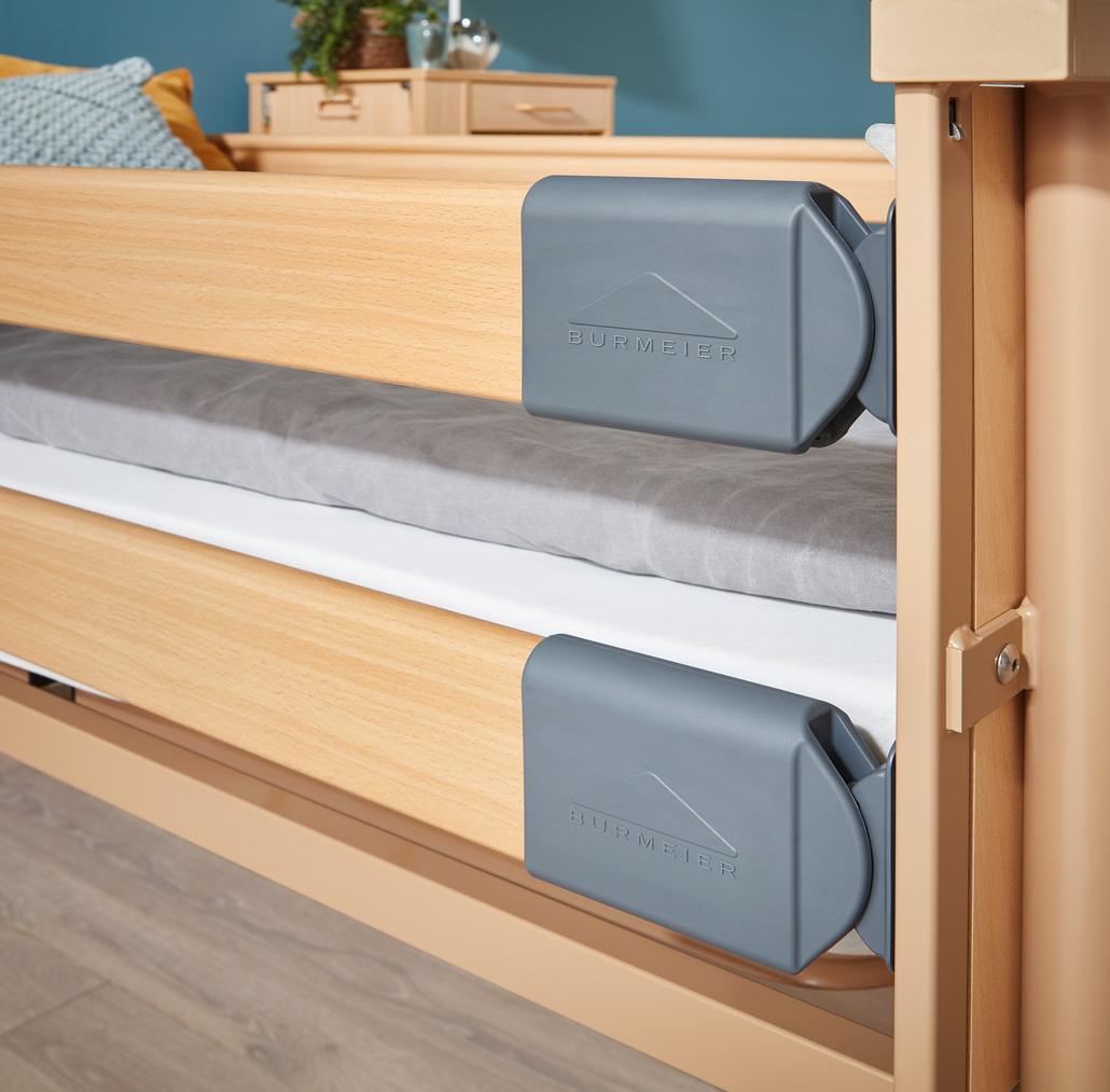 Nehmen wir als Beispiel den Einlegerahmen von Burmeier. Er wird einfach in einen bestehenden Bettrahmen eingesetzt und wandelt Ihr Bett in ein vollwertiges Pflegebett um. Er bietet die gleiche elektrische Höhen- und Liegeflächenverstellung wie ein klassisches Pflegebett.